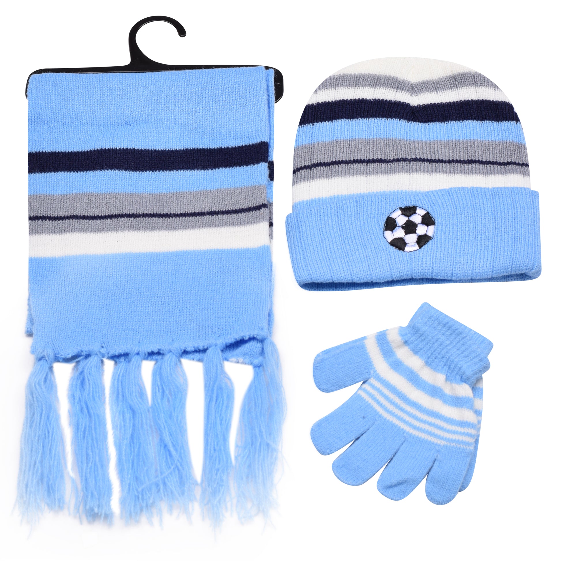 Keep kids cosy and stylish this winter with our 3-piece knitted hat, scarf, and gloves set. Each set features colourful horizontal stripes and a fun embroidered soccer ball on the hat — perfect for young sports fans and outdoor adventures. Made from soft, stretchable acrylic knit for lasting warmth and comfort.