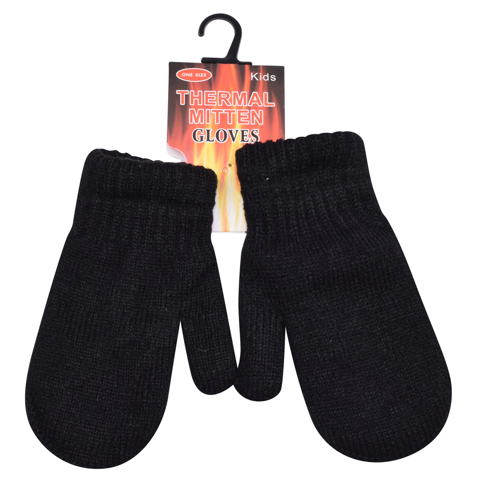 Kids thick (padded) Magic Mitten Gloves made with soft, stretchy material for a comfortable fit. Each pack includes 12 pairs (all black). These gloves help keep hands warm and are suitable for everyday winter wear.